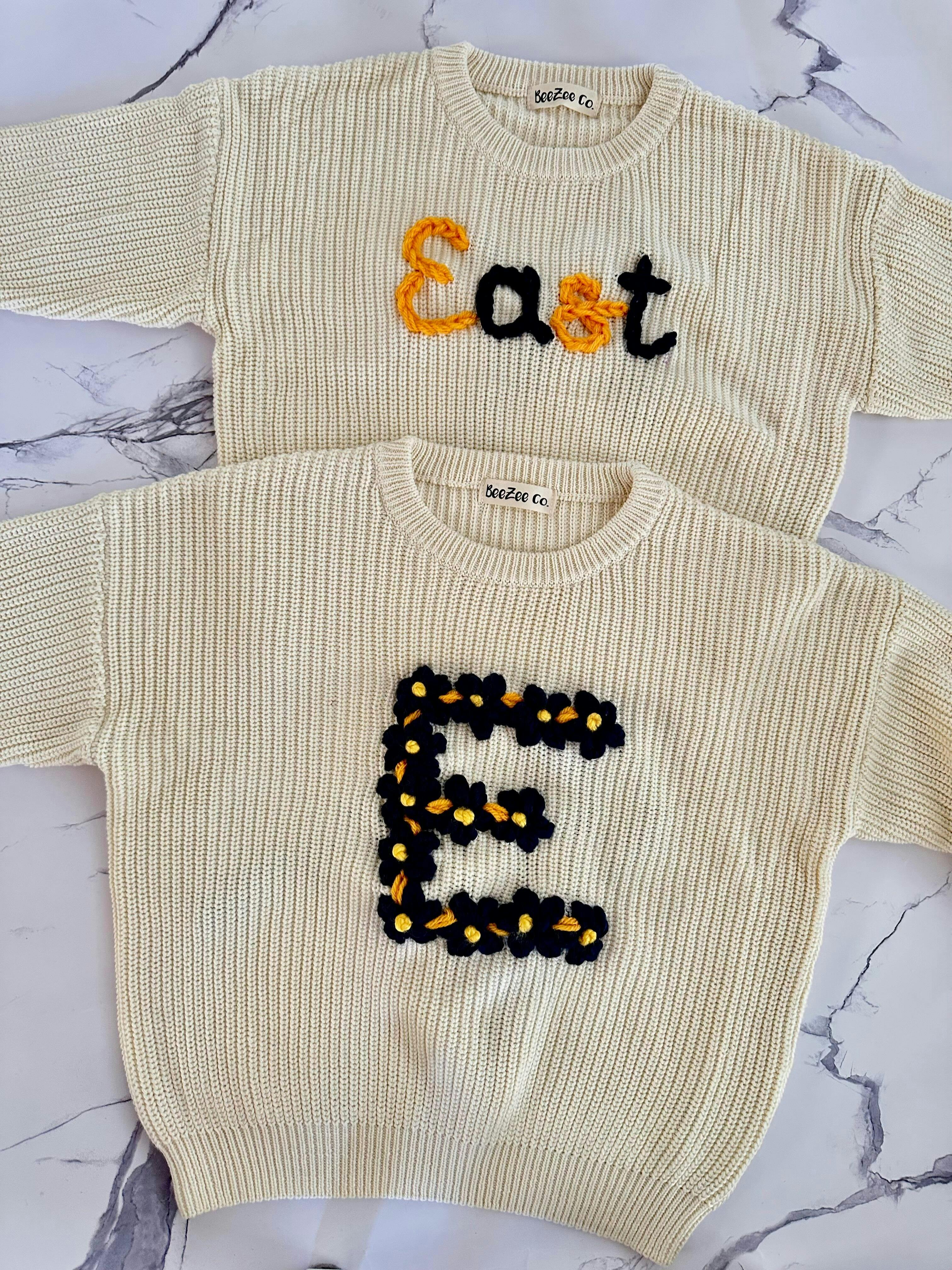Hand embroidered LETTER sweater for your little. Makes a great gift. The little can wear and then save as a keepsake for years to come. Cute for birth announcements, monthly photos, gender reveals and more.