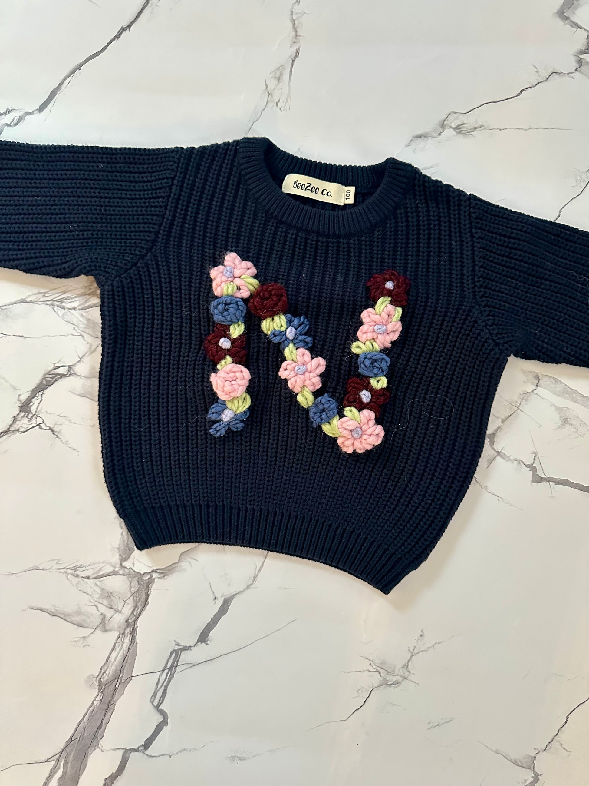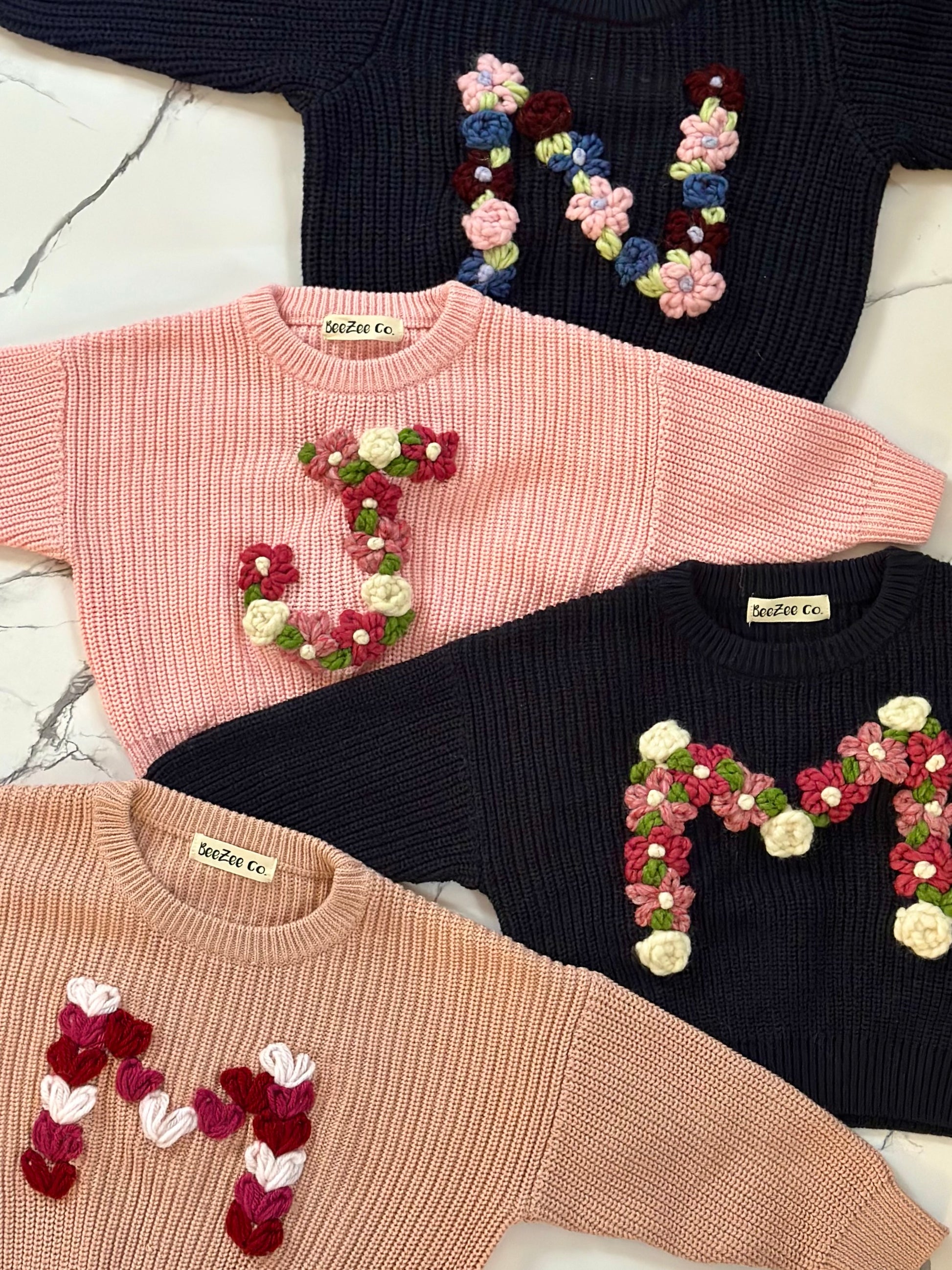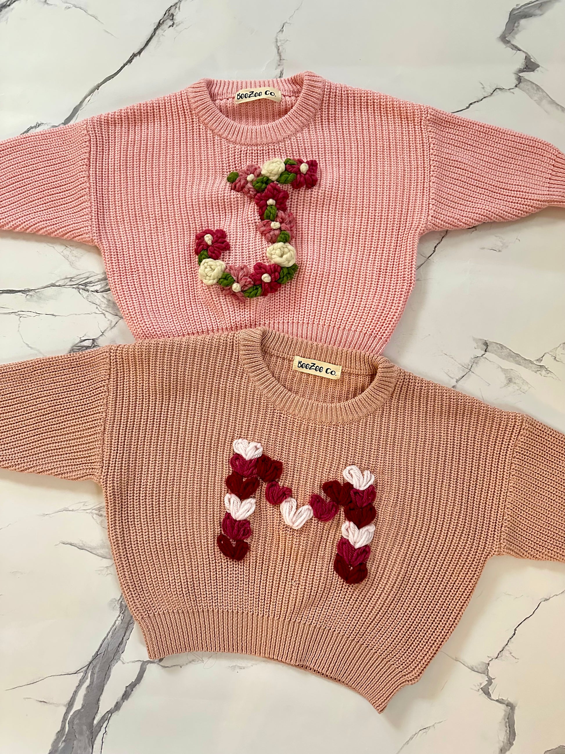 Each sweater is crafted from 100% cotton knit, making it soft, breathable, and comfortable for everyday wear. The hand-embroidered letter adds a timeless, personal touch—creating a one-of-a-kind piece that feels both special and easy to style.