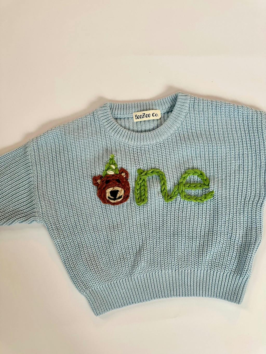 A hand-embroidered name and custom design on a premium 100% cotton chunky knit sweater.